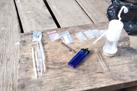 Dari hasil penggeledahan, petugas menemukan satu sachet klip berisi kristal bening diduga sabu, alat hisap (bong), lima sedotan modifikasi, pirex kaca, jarum, korek gas, silet, paku, dan kertas timah rokok.