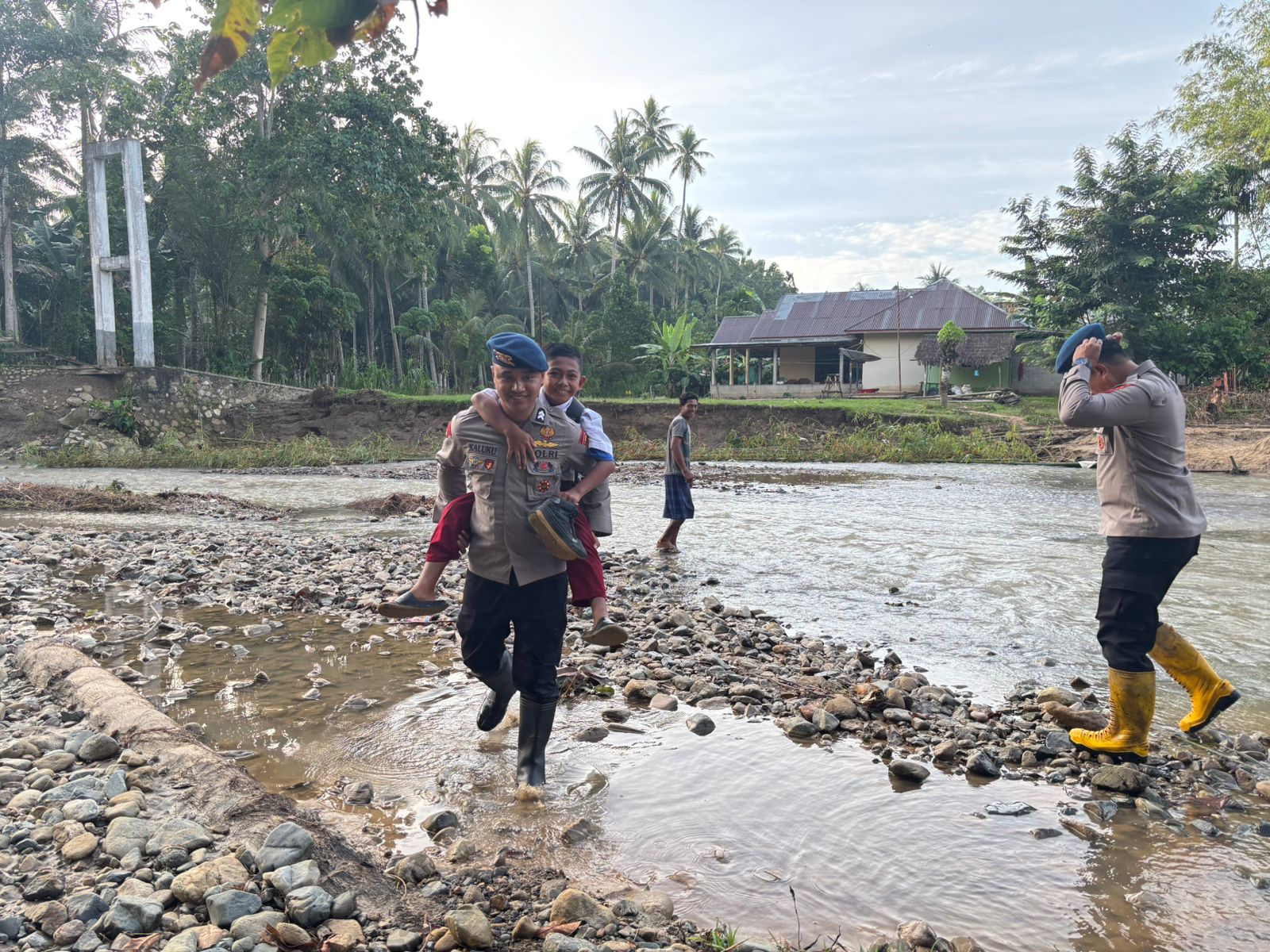 Ia menegaskan, selain membantu penyeberangan warga dan anak-anak sekolah, personel Brimob juga berkoordinasi serta bergotong royong bersama masyarakat setempat. Sinergi tersebut dinilai penting agar penanganan dampak banjir dapat berjalan lebih cepat dan aman.